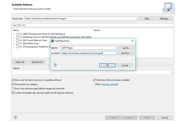 First, prepare development environment for CDS view. Eclipse is a tool where a user creates ABAP developments on HANA. Before downloading eclipse, ensure that JRE and SAP GUI are available on system. Once Eclipse has been installed, open it by a double-click on its icon. Now, get ADT plugin to connect with ABAP backend system. Go to HELP-> Install new software. Click on the ADD button, give a name to plugin and location as a site (https://tools.hana.ondemand.com/oxygen)