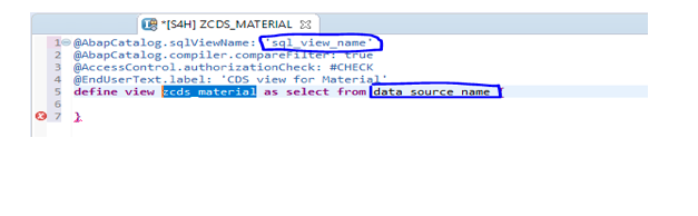Click on finish. It will open CDS view in source code editor where provide a name for DDL SQL view i.e. visible in SE11 and data source name(table name). Notice how the description and CDS view name is already assigned here.
