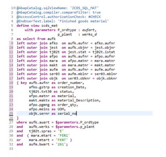 Below is an example of CDS view with joins and parameters where order type and plant number is passed as a parameter to fetch all order numbers, order status, material number and serial number information where material type is ‘finished goods' and movement type is ‘261’.