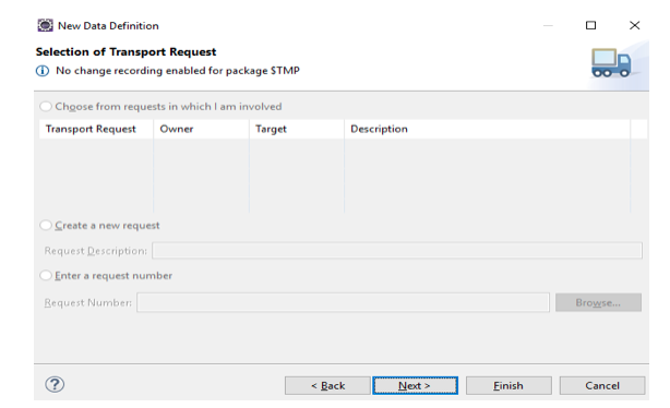 Click on next. Next screen would ask for a transport request, assign a new name to it.