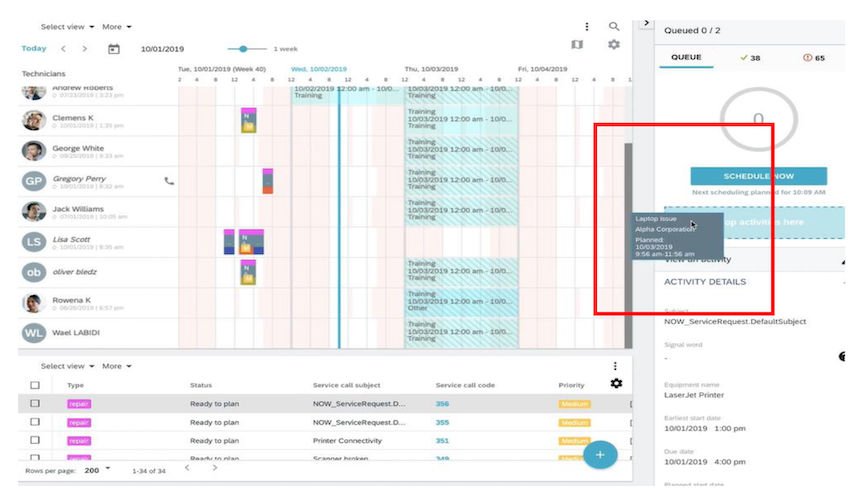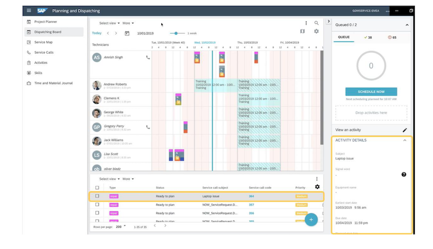 Additionally, detailed information on each service call can be viewed, and additional information or attachments can be added using the ACTIVITY DETAILS panel on the bottom right as shown below.